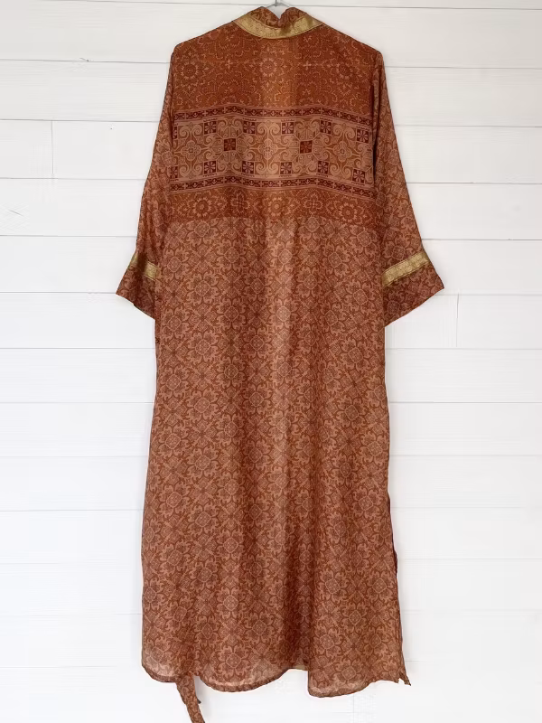Denna kimono är tillverkad av återvunna sari som Indiska kvinnor har burit med stolthet. Vi älskar tanken att återanvända vackra tyger "slow fashion" när den är som bäst.