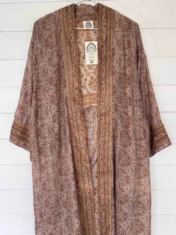 Denna kimono är tillverkad av återvunna sari som Indiska kvinnor har burit med stolthet. Vi älskar tanken att återanvända vackra tyger "slow fashion" när den är som bäst.