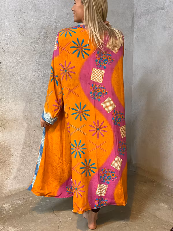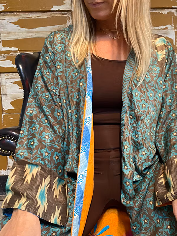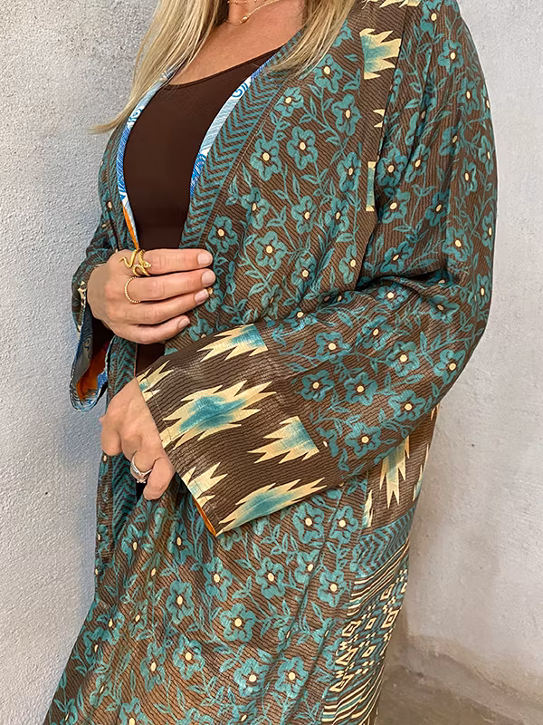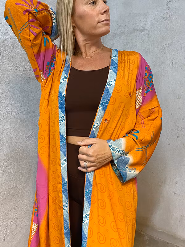 Denna kimono är tillverkad av återvunna sari som Indiska kvinnor har burit med stolthet. Vi älskar tanken att återanvända vackra tyger "slow fashion" när den är som bäst. Samtliga tyger är tvättade före man har sytt om dom till trendiga kimonos. Därför kan man också se spår av att plaggets tyg har blivit använt sen tidigare.