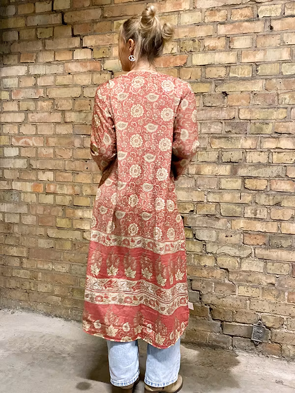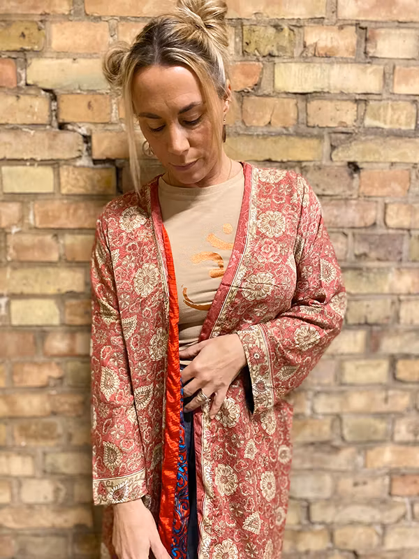 Denna kimono är tillverkad av återvunna sari som Indiska kvinnor har burit med stolthet. Vi älskar tanken att återanvända vackra tyger "slow fashion" när den är som bäst. Samtliga tyger är tvättade före man har sytt om dom till trendiga kimonos. Därför kan man också se spår av att plaggets tyg har blivit använt sen tidigare.