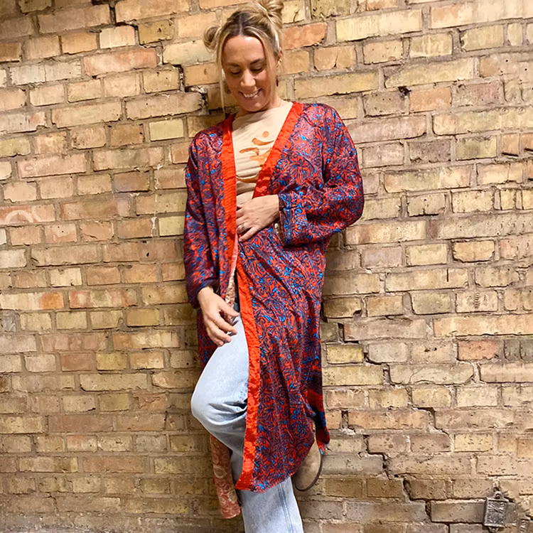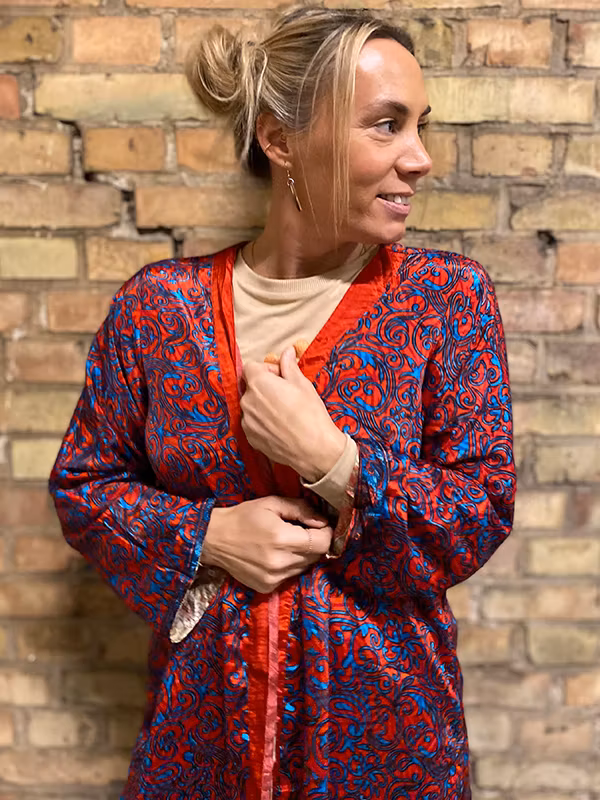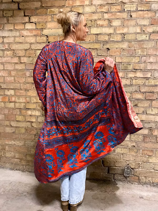 Långa och bohemiska kimonos tillverkade i återvunnet silke. Supervackra kimonos som dessutom är vändbara, så du får 2 kimonos för en! Bär den till yoga, till stranden eller varför inte en kväll ute med gänget. Passar det flesta (ungefär storlek 36-44) Rak i modellen med fint fall.  Det finns inte två lika kimonos. Samtliga är unika då de tillverkas av återvunnet tyg.