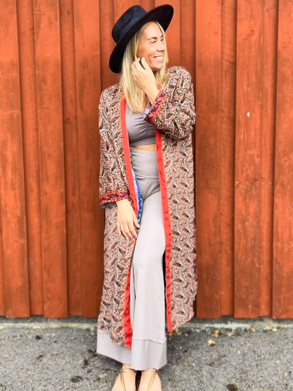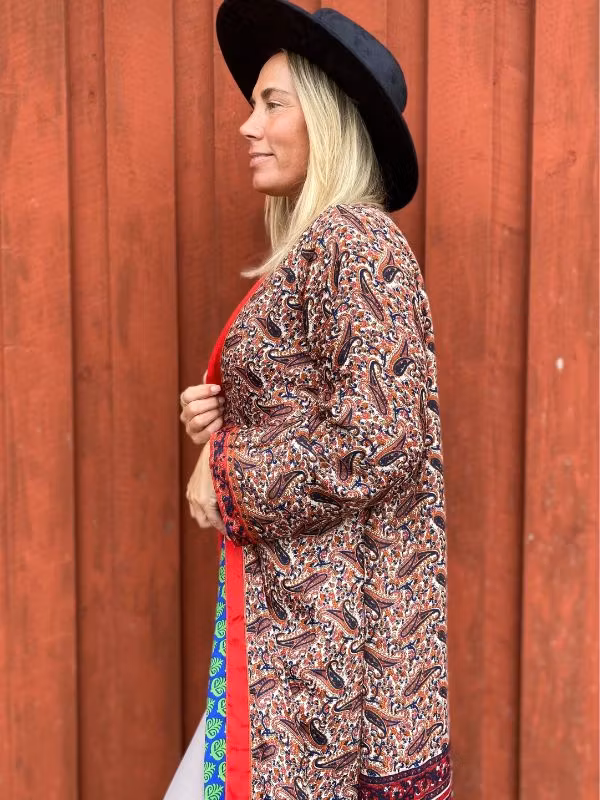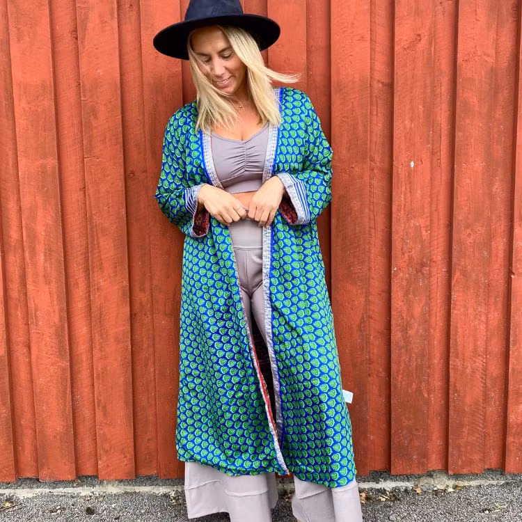 Långa och bohemiska kimonos tillverkade i återvunnet silke. Supervackra kimonos som dessutom är vändbara, så du får 2 kimonos för en! Bär den till yoga, till stranden eller varför inte en kväll ute med gänget. Passar det flesta (ungefär storlek 36-44) Rak i modellen med fint fall. Det finns inte två lika kimonos. Samtliga är unika då de tillverkas av återvunnet tyg.