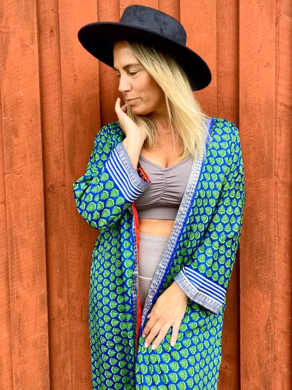 Denna kimono är tillverkad av återvunna sari som Indiska kvinnor har burit med stolthet. Vi älskar tanken att återanvända vackra tyger "slow fashion" när den är som bäst. Samtliga tyger är tvättade före man har sytt om dom till trendiga kimonos. Därför kan man också se spår av att plaggets tyg har blivit använt sen tidigare.