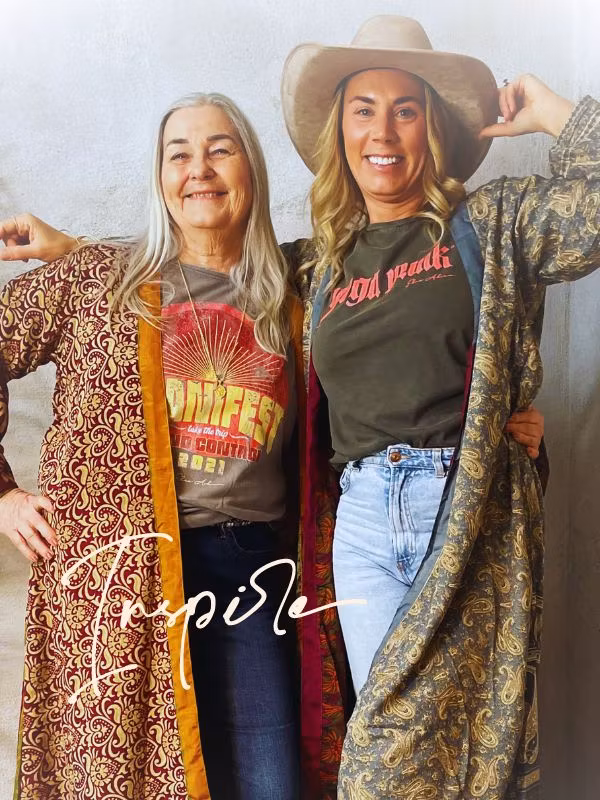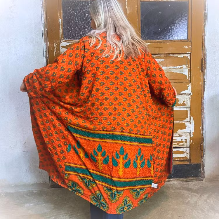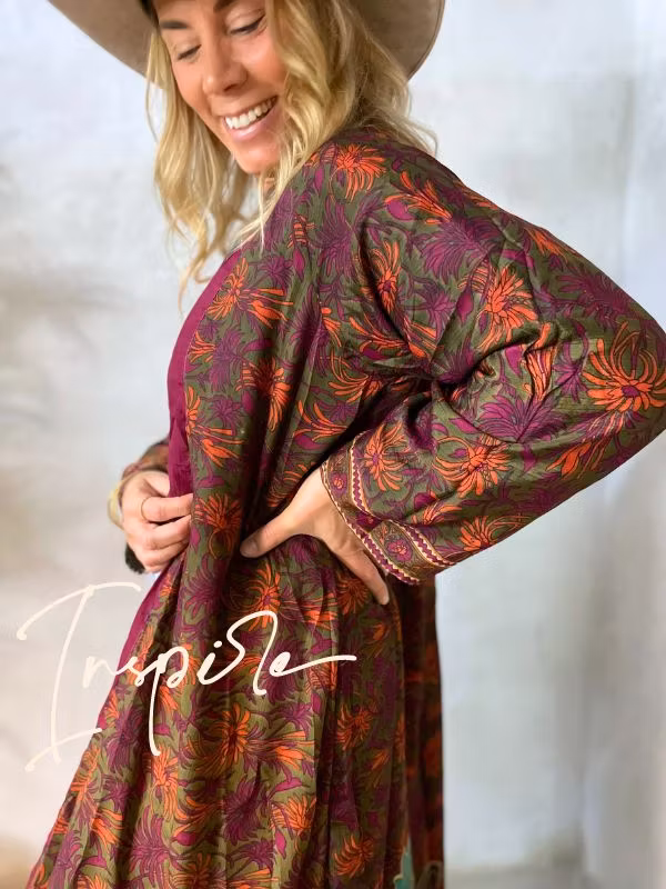 Denna kimono är tillverkad av återvunna sari som Indiska kvinnor har burit med stolthet. Vi älskar tanken att återanvända vackra tyger "slow fashion" när den är som bäst. Samtliga tyger är tvättade före man har sytt om dom till trendiga kimonos. Därför kan man också se spår av att plaggets tyg har blivit använt sen tidigare.