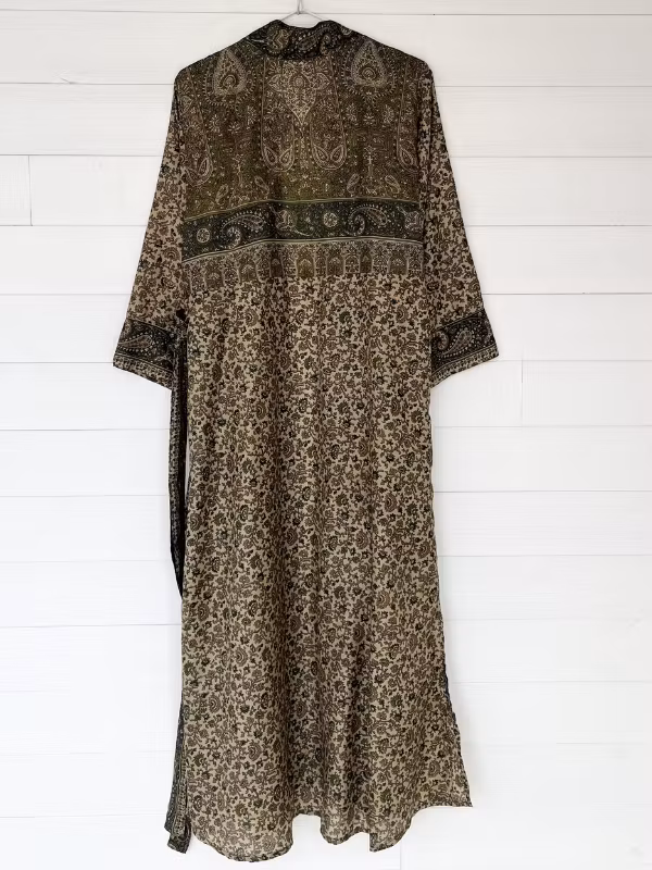 Att välja en kimono i återvunnen sari är inte bara ett stilval – det är också ett steg mot hållbart mode och slow fashion. Genom att återbruka textilier förlängs livscykeln för vackra tyger och varje plagg får nytt liv.