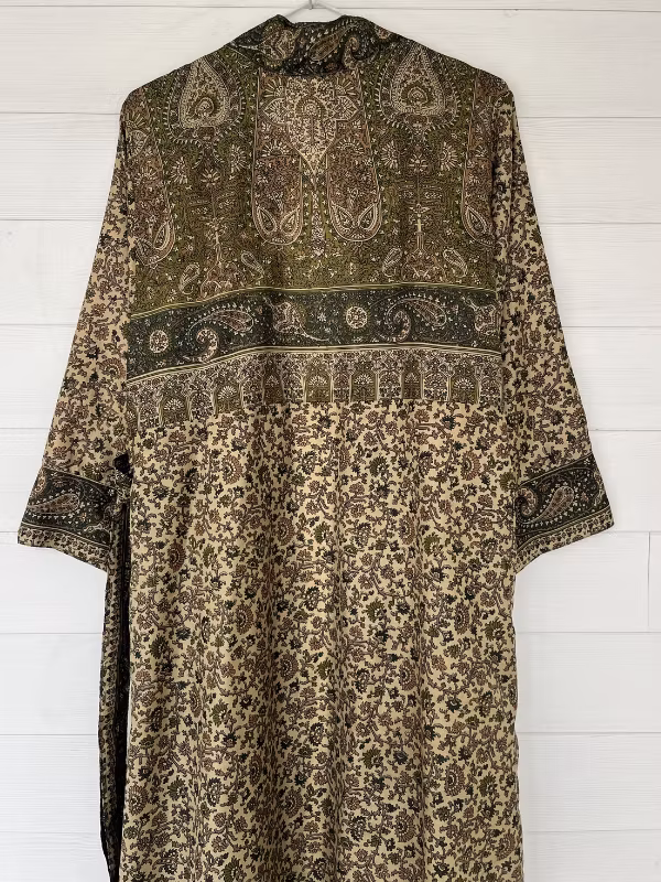 Denna kimono är tillverkad av återvunna sari som Indiska kvinnor har burit med stolthet. Vi älskar tanken att återanvända vackra tyger "slow fashion" när den är som bäst.