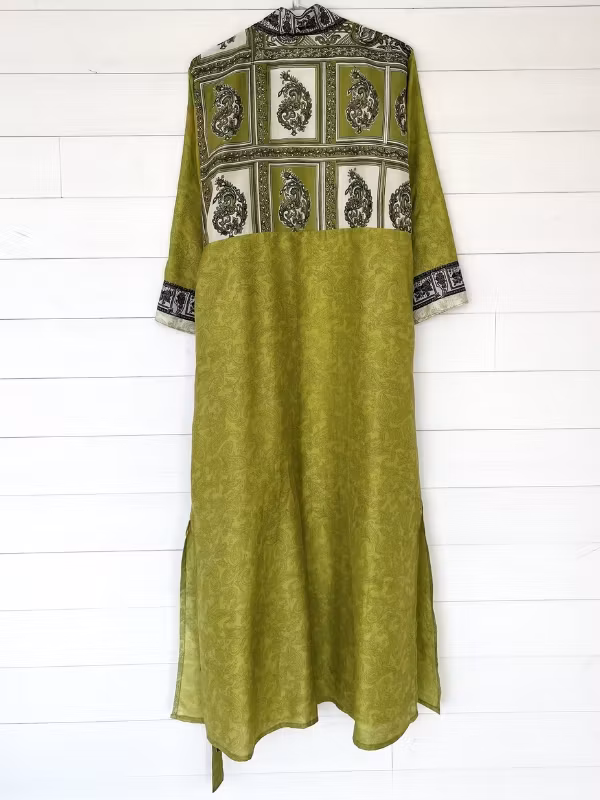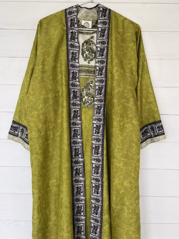 Denna kimono är tillverkad av återvunna sari som Indiska kvinnor har burit med stolthet. Vi älskar tanken att återanvända vackra tyger "slow fashion" när den är som bäst.
