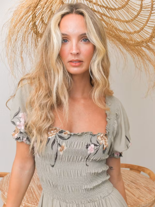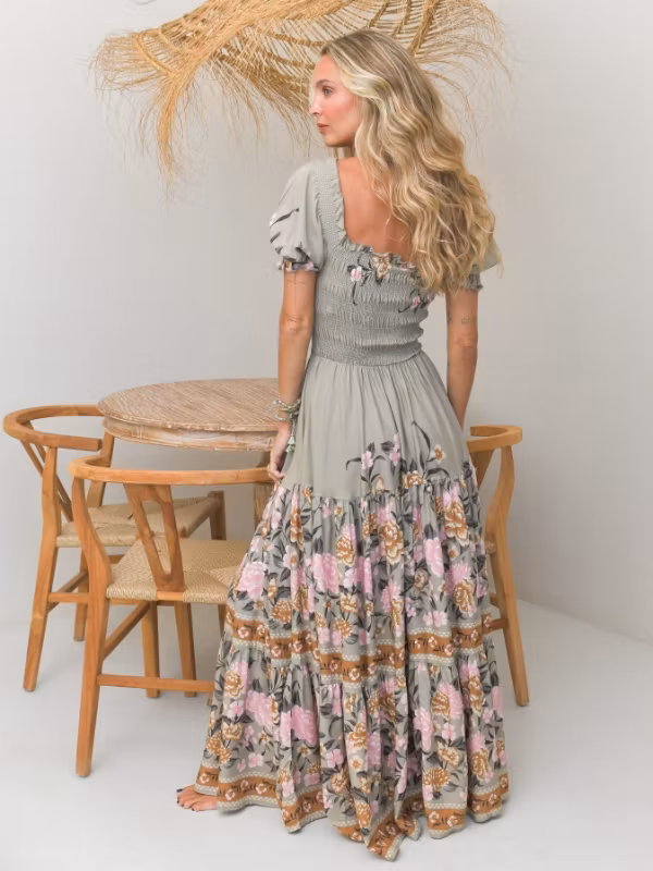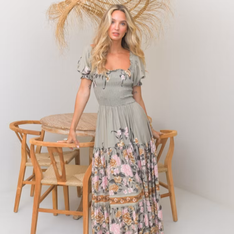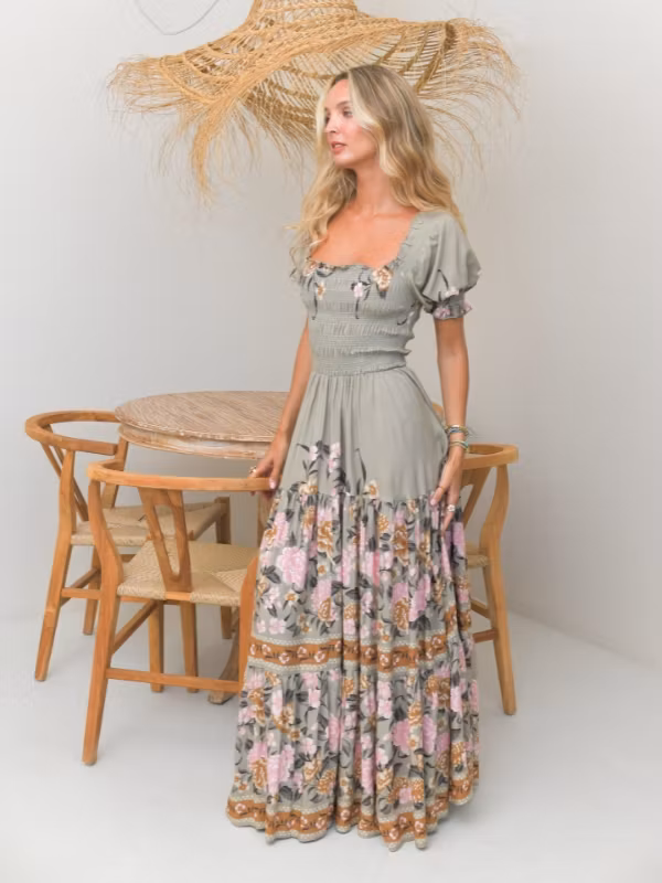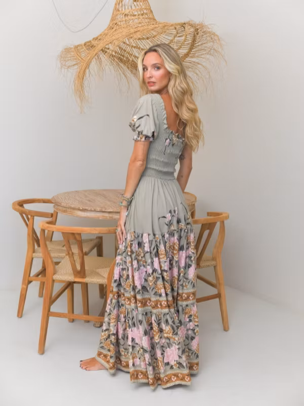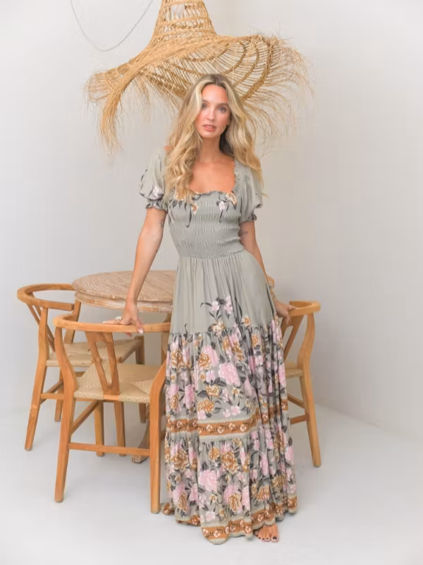 En otrolig, härlig och bohemisk klänning från det australiensiska märket Jaases vårkollektion! Klänningen är enkel, men med ett vackert mönster och smickrande passform. Med sin botten av en grå/grön färg och med romantiskt motiv av blommor i rosa, gyllene brunt och grönt är denna klänningen ett ultimat vårplagg. Överdelen är kortärmad med något puffiga/pösiga ärmslut och i smockat tyg med bra stretch och en fyrkantig linning. Nederdelen flyter sedan ut i en bred och hellång drapering med härligt flow.