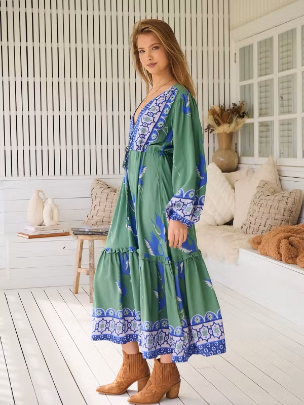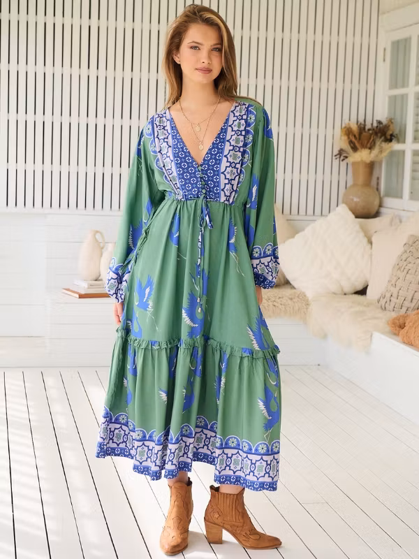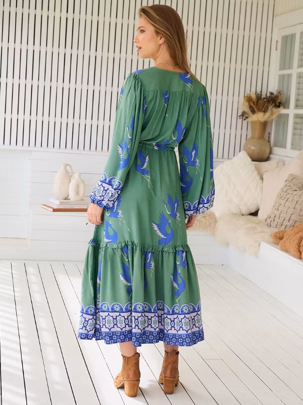 En riktigt drömmig klänning från australienska Jaase i ett print som föreställer fåglar liknande hägrar samt mosaikinspirerat mönster i blått och vitt på en grön botten. Detta är en romantisk klänning som passar till de allra flesta tillfällena. Puffiga hellånga ärmar med elastiskt band som drar ihop ärmslutet ger volym och en klädd känsla. Klänningen är "midi"-modell vilket betyder att den slutar vid vaderna.