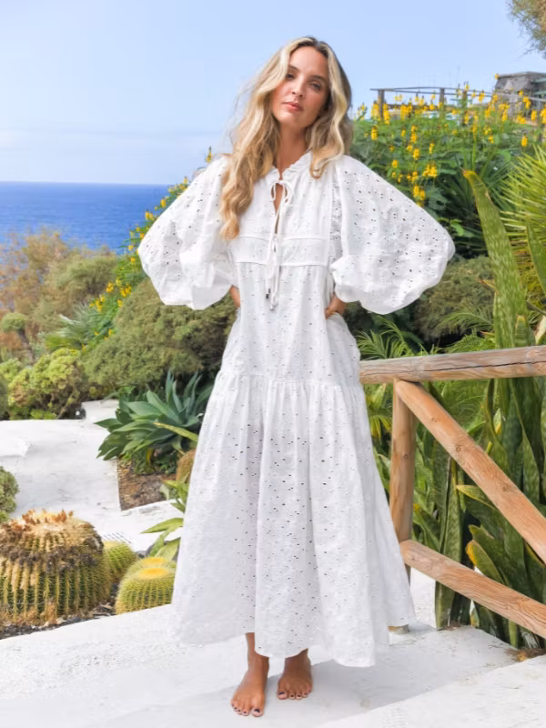 Klänningen av 100% bomull är en broderad vit dröm i en flowig modell som där ballongärmar och pösig nederdel skapar en vacker siluett. Kan bäras precis som den är eller tillsammans med ett brett skärp för att accentuera midjan. Mönstret på broderierna är blommor där vissa delar är håliga så att huden skymtas igenom. Klänningen är ganska djupt v-ringad med en smal krage som knyts samman med en snörning. Lämna den oknuten för att visa mer hud eller knyt tight för en mer klädd känsla.