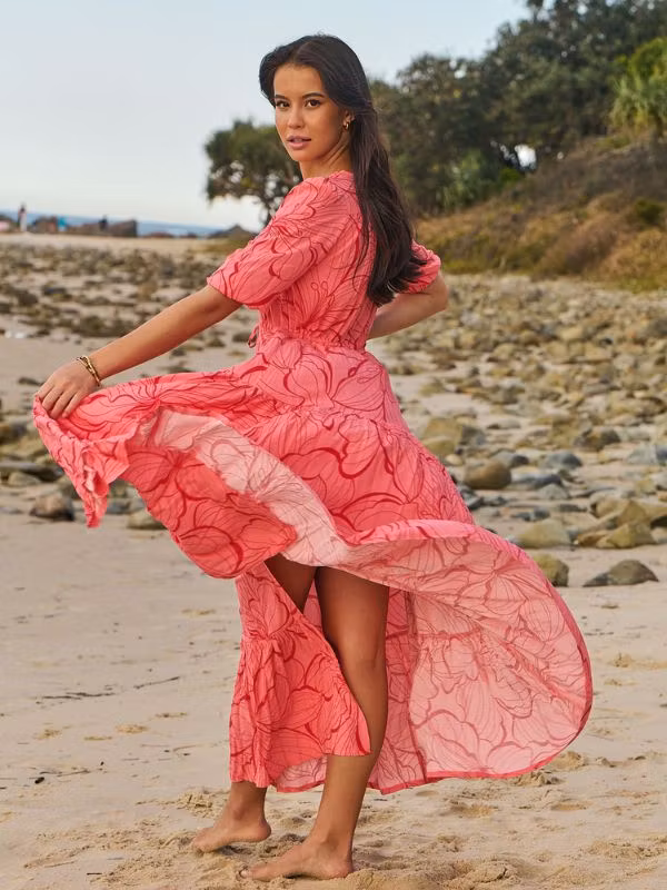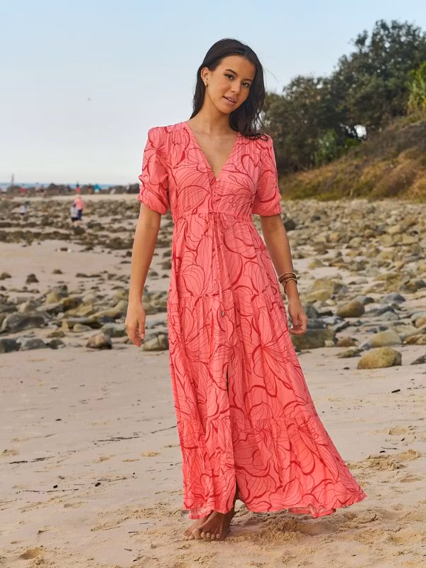 En magisk, bohemisk långklänning från australiensiska Jaase – perfekt för dig som älskar boho-stilen. Den här blommiga klänningen i mjuka rosa och röda toner är både romantisk och bekväm, med en avslappnad passform och justerbar midja med knytband.