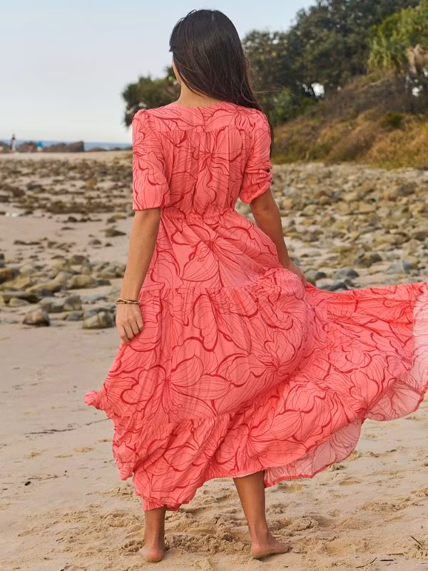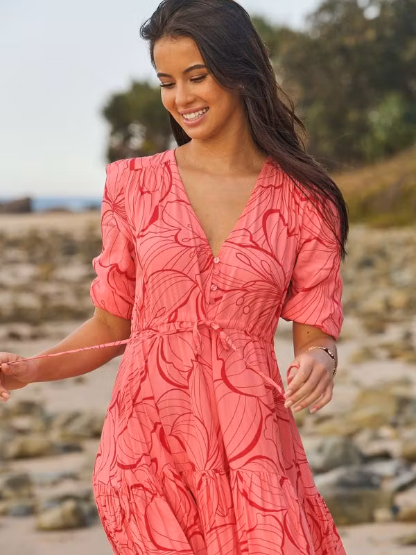 Klänningen har en djupare V-ringning framtill med dekorativa korallfärgade knappar hela vägen – bär den öppen eller stängd beroende på humör. De 3/4-långa ärmarna avslutas med resår, och under bysten finns en lätt drapering som ger en fin form och fall. Diskret volang i nederdelen för extra rörelse.