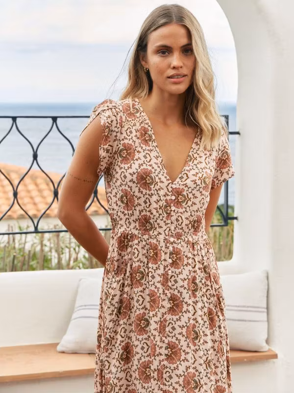 Den här klänningen från australiensiska Jaase är som gjord för dig som gillar när det är snyggt utan att kännas uppklätt. Mjuka naturfärger i brunt, senap och en hint av mörkgrönt (ja, kolla detaljerna!) gör den lätt att matcha med det mesta – boots, sandaler eller barfota i gräset.