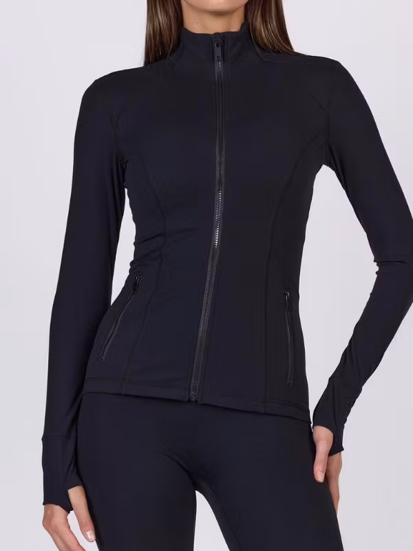 Den höga kragen och dragkedjan framtill ger extra skydd mot kyla och vind – perfekt för promenader till och från studion eller tidiga morgonpass. Tumhål i ärmarna och praktiska fickor med dragkedja gör jackan lika funktionell som bekväm.