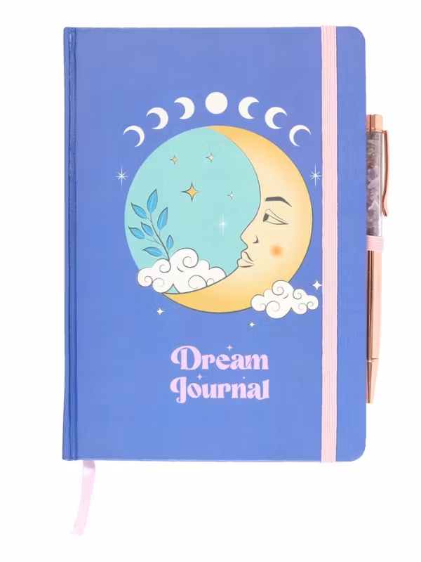 - Tryck: Vackert tryck av en gul måne mot en blå botten och med text "Dream Journal".