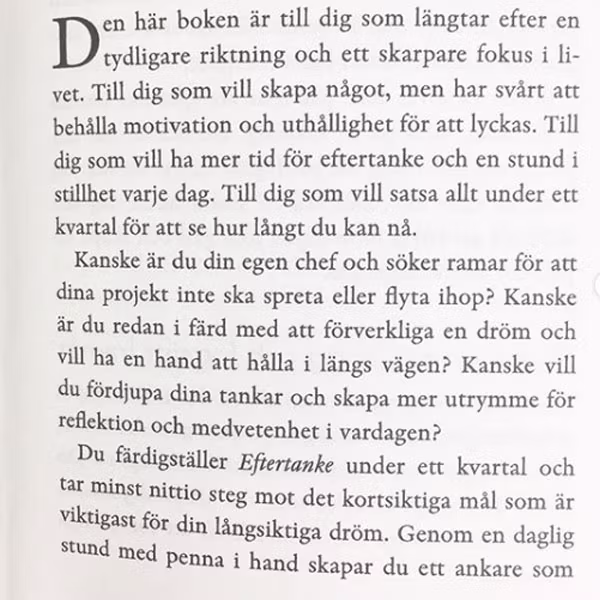 Eftertanke är en praktisk arbetsbok för den dröm du vill förverkliga. Du tydliggör var du befinner dig, vart du är på väg och får i 90 dagar hjälp med att bygga på din dröm.