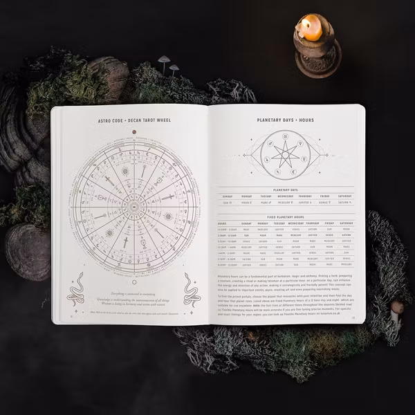 Kalendern i sig själv är en liten juvel bland böcker med ett vackert bokomslag i veganskt läder och ett helt otroligt holografiskt guldfolierat tryck på fram och baksida. Man blir helt salig av att bläddra i denna kalender med sina magiska illustrationer och guldkantade sidor. Man lockas in astrologins hemligheter och försvinner in i kosmos labyrint av himlakroppar.