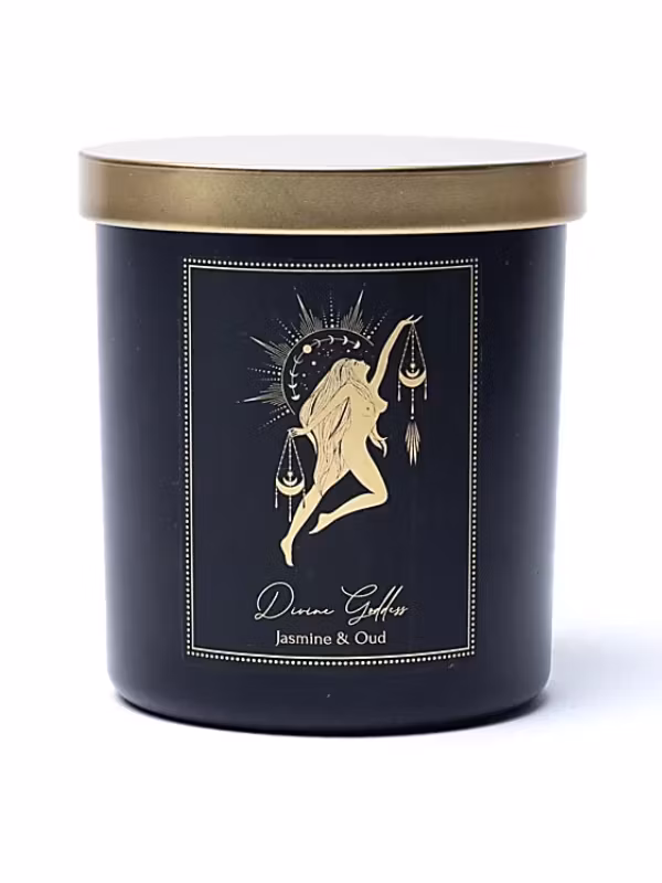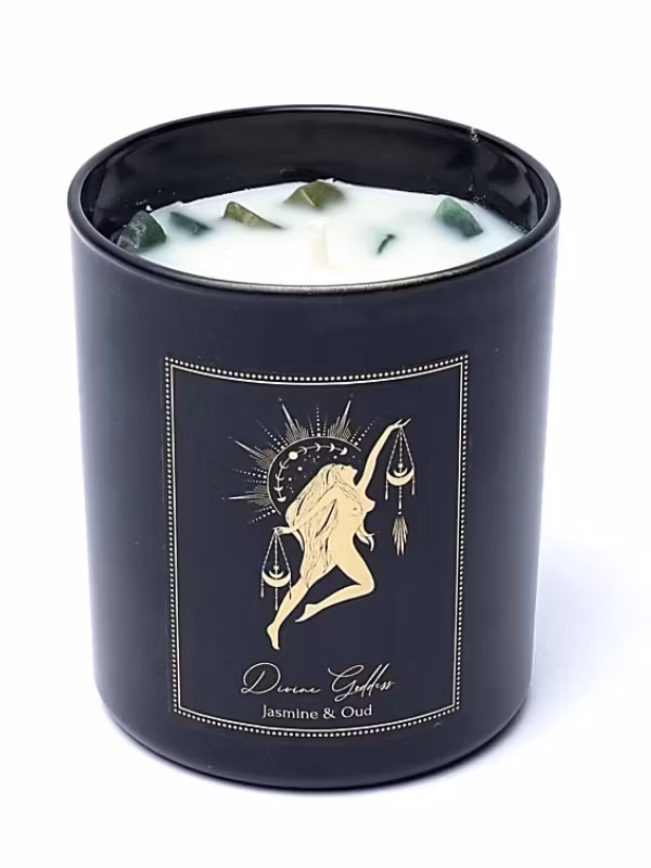 Doftljuset Divine Goddess doftar av jasmin och oudh stimulerar kreativitet och intuition, samtidigt som den håller dig grundad och centrerad. När ljuset brinner sjunker de inbäddade xinji jade-stenarna sakta ner i vaxet – symboler för balans, klarhet och förnyad energi. När ljuset brunnit ner kan du med fördel spara stenarna som en påminnelse om din intention.