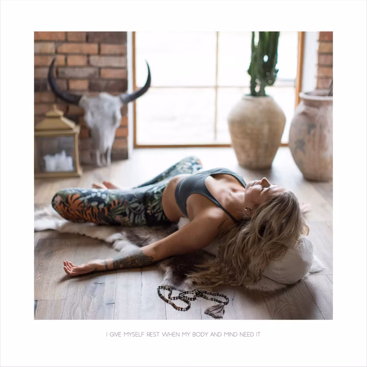 Till varje motiv hör en affirmation, ett positivt budskap som hjälper dig att förstärka dina inre tankar om dig själv. Budskapet här är "I give myself rest when my body and mind need it".