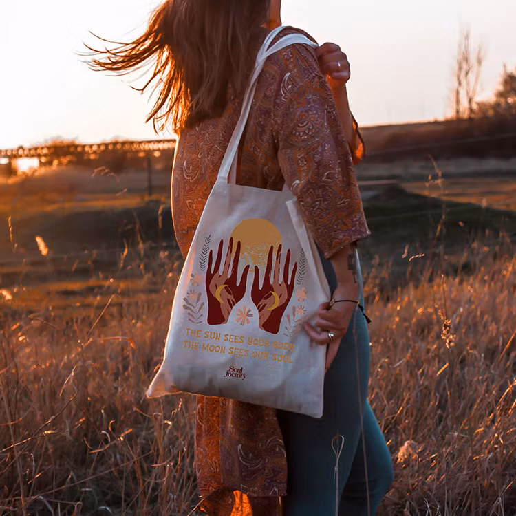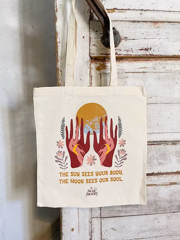 Inspirerande citat som sprider good vibes, "The Sun sees your body, The Moon sees your Soul" gör denna tygkasse till en riktig favorit .