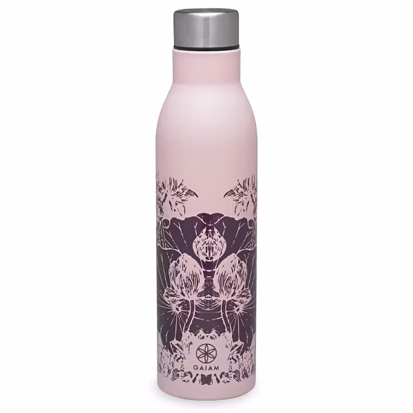Vattenflaskan Floral från Gaiam är en snygg BPA-fri vattenflaska i rostfritt stål som rymmer 0,75 L. Flaskan har en ljusrosa botten med ett vackert plommonfärgat tryck. Rostfritt stållock som är läckagesäkert. Bred öppning så du kan stoppa ner isbitar så vattnet håller sig kylt längre.