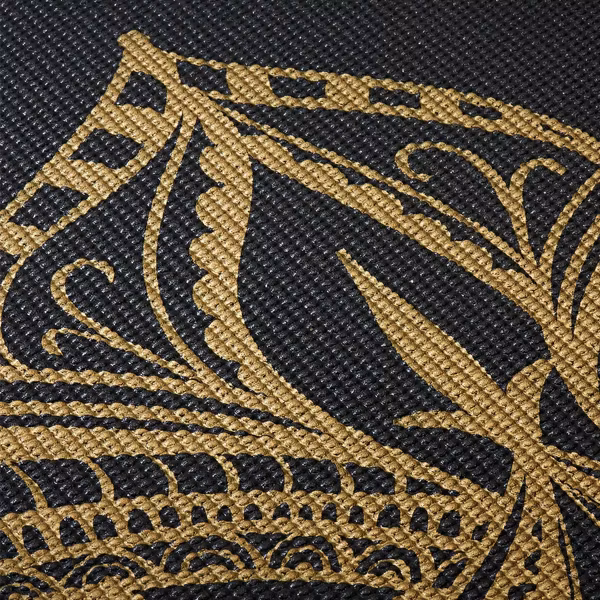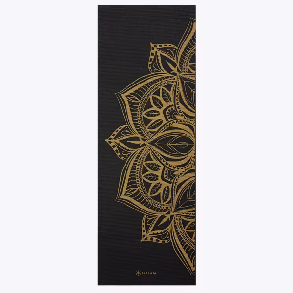 Yogamattan Gaiam Bronze Medallion Mandala är en svart matta med vackert guldfärgat tryck. Mönstret är en vacker mandala som delats på hälften.