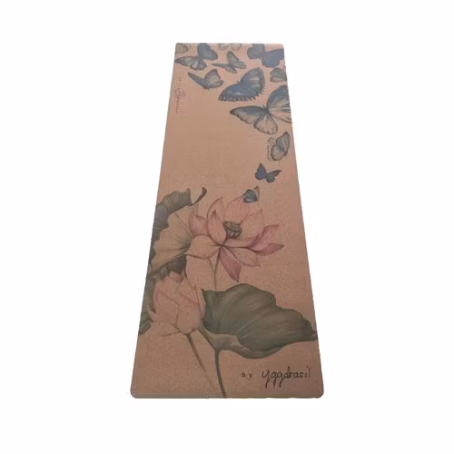 Resematta av kork och naturgummi som inte bara är halkfri och ekologisk utan även så vacker så du inte kan sluta titta på den! Vackert tryck av lotusblomma & fjärilar, designad tillsammans med Emila Löf Karlsson (@namaste_by_emilia). Extra tunn 0,9cm gör att det är väldigt enkelt att ta med sig på resan.